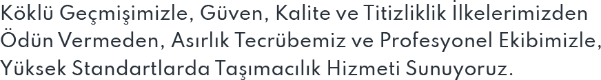 1893’ten bu yana edindiğimiz köklü deneyim, modern taşımacılık çözümlerimiz ve müşteri memnuniyetine verdiğimiz önemle fark yaratıyoruz. Asırlık tecrübemizle güvenli, hızlı ve profesyonel taşımacılık sunuyoruz.